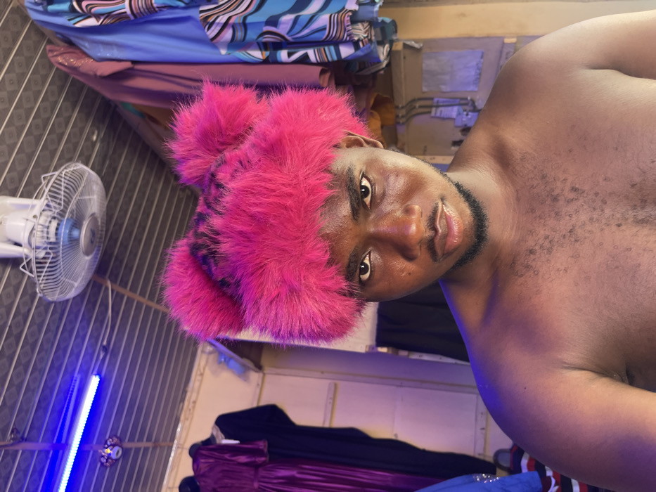A shirtless adult male, estimated to be in his 20s to 30s, is depicted in a close-up portrait within an indoor commercial establishment in Samaru, Nigeria. He wears a vibrant, bright pink faux fur hat featuring two prominent ear-like structures, with darker, possibly leopard-print, patterns visible beneath the fur. His face, exhibiting a short beard and noticeable perspiration on the forehead and nose, maintains a direct, neutral gaze toward the camera. The background reveals a retail environment, likely a clothing shop or market stall. Various garments are suspended on display: a long, dark purple or burgundy dress and another black garment hang on the left. On the right, multiple patterned fabrics, including blue, black, and white abstract designs, are visible. The ceiling, appearing to be constructed of ribbed metal or plastic, is light-colored. Mounted on the ceiling are a horizontal blue LED strip light on the left and a white, caged ceiling fan, which appears inactive, positioned towards the upper right. Light-colored walls and some exposed wiring or utility boxes are visible in the background.