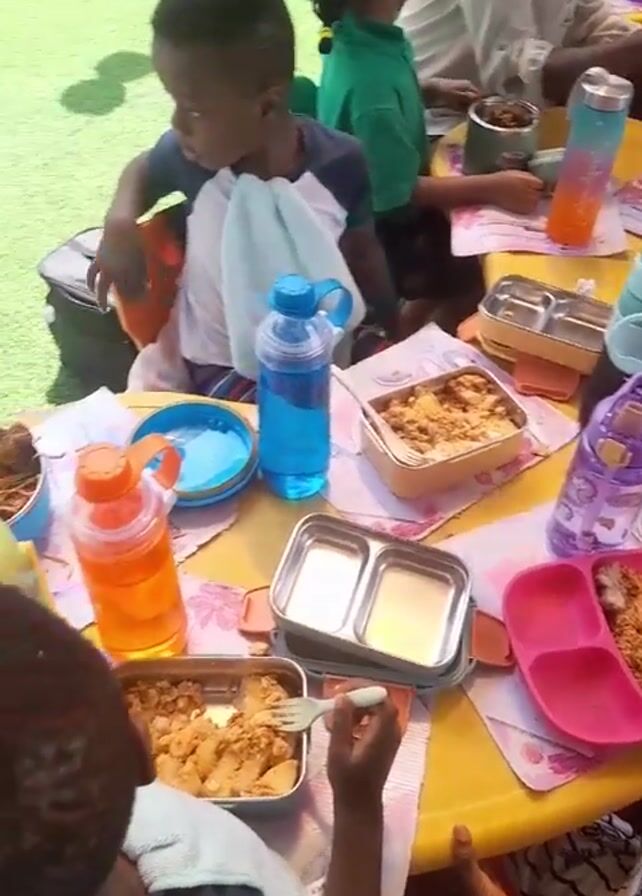 group of young children, likely preschoolers, eating lunch at tables set up in an outdoor play area. The children are seated on small, brightly colored chairs around a yellow tablecloth-covered table. They are mostly of African descent. Each child has a lunchbox or container with food, and many have water bottles. The meals appear to be homemade, including items like rice, potatoes, and pasta. A woman, presumably a teacher or caregiver, is seated at one table assisting the children. In the background, there’s artificial turf, toys such as a toy car and inflatable pool toys, and some other children are seen playing or resting. The environment appears to be a daycare or preschool setting. The camera moves, showing different angles of the children eating.