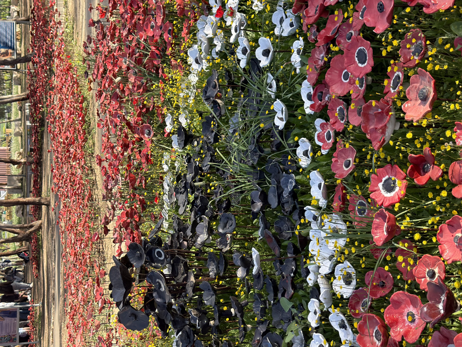 An outdoor art installation or memorial is depicted within the Eshkol Regional Council, Israel. The scene features a field of thousands of artificial flowers crafted from a durable material, resembling ceramic. The foreground displays rows of red, white, and black flowers, each with a dark center, intermingled with natural small yellow flowers and green foliage. A prominent patch of entirely black artificial flowers occupies the mid-ground. The background extends into a large field primarily populated by red artificial flowers. Each flower is mounted on a slender stem. In the distant background, several indistinct human figures walk on an unpaved path among trees, indicating a public area under natural daylight.