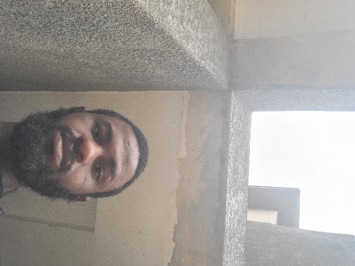 A man with dark skin and a beard looks towards the camera. Above him, a textured ceiling transitions to a beige wall. To the right, a concrete structure forms an opening, offering a glimpse of a building against a bright, washed-out sky. The image has a grainy texture, possibly due to the camera quality or lighting conditions.