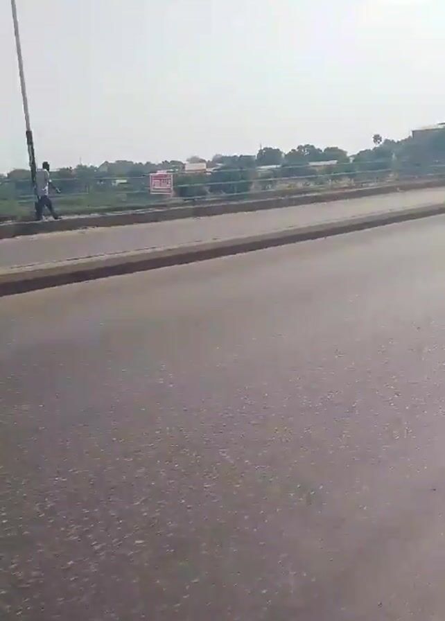 roadway with various vehicles and a pedestrian. At the beginning of the video, a motorcycle and an auto rickshaw are visible in the distance. A black car then passes by the camera. A pedestrian dressed in white can be seen walking on the side of the road. The background includes buildings and trees in the distance. The roadway appears to be a bridge over a body of water. There is a light pole near the edge of the road.