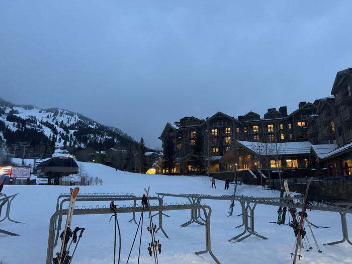 A winter scene shows a ski resort at twilight. The foreground features ski racks holding skis and poles, with a snowy slope leading up to a ski lift and a mountain partially obscured by clouds. A large building, possibly a hotel, dominates the right side, its windows glowing with warm light. People are seen skiing down the gentle slope. The sky is overcast, creating a muted, cool atmosphere.