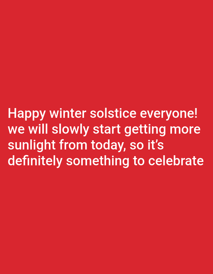 A bright red background displays the text "Happy winter solstice everyone! we will slowly start getting more sunlight from today, so it's definitely something to celebrate" in white, sans-serif font