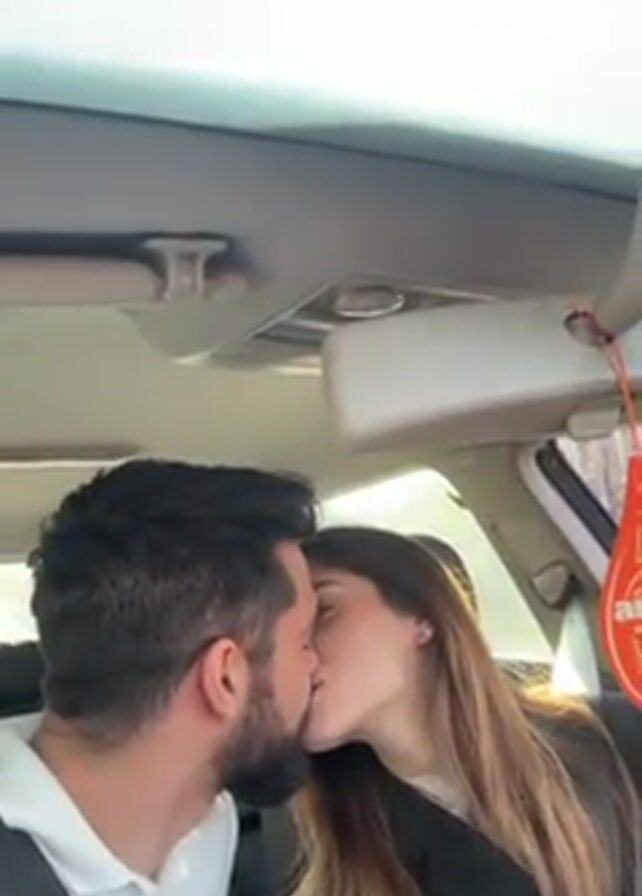 A man and a woman are kissing in the front seats of a car. The man is on the left and has a dark beard and mustache. He is wearing a light-colored collared shirt. The woman on the right has long brown hair and is wearing a black jacket or sweater. They are facing each other and kiss deeply. The interior of the car is visible, including the ceiling, sun visor, and an air freshener hanging from the rearview mirror. The sun is shining through the window.