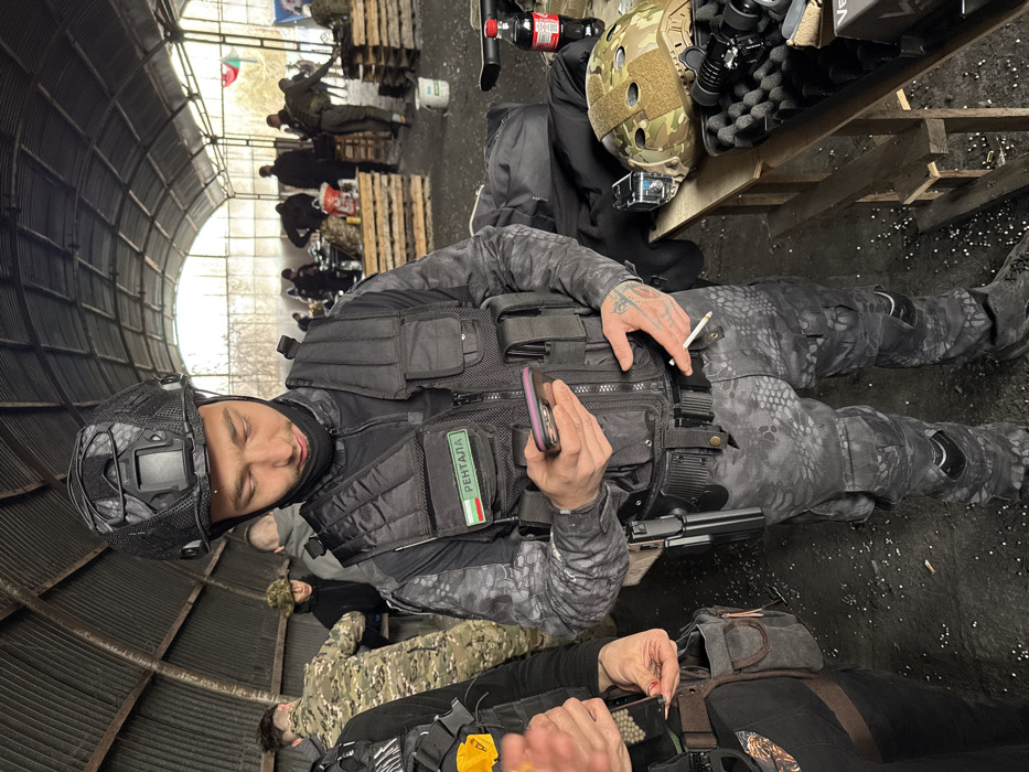 The image depicts an indoor scene within a large, arched-roof structure, likely a repurposed hangar or industrial building, located in Svetovrachene, Bulgaria. The structure features exposed metal support beams and a corrugated metal roof, with natural light entering from an open end or large windows. The ground is a dark, uneven surface, possibly dirt or concrete, with small white pellets scattered, consistent with airsoft BBs. In the foreground, an adult male stands centrally, looking down at a smartphone with a purple case held in both hands. He wears a black tactical helmet, a black balaclava pulled below his chin, and a black tactical vest over a black and grey camouflage long-sleeve top. A green patch with the Bulgarian flag and the Cyrillic word "РЕНТАЛА" (RENTALA) is affixed to his vest. He also wears matching black and grey camouflage tactical pants and a black tactical belt with a holstered black pistol on his right hip. A lit cigarette is held between the index and middle fingers of his left hand, and a tattoo is visible on his left forearm. To the immediate left, a partial view of another person shows hands holding a metallic object, possibly a magazine, near a dark tactical vest. In the mid-ground and background, several other individuals, predominantly males, are visible. They are dressed in various camouflage patterns (e.g., woodland, multicam-style) and tactical gear, moving around or interacting near makeshift tables constructed from wooden pallets. On a wooden table to the right of the central figure, a tan and brown camouflage tactical helmet with a side mount, a black action camera, a red bottle of Coca-Cola, and a black case with foam inserts holding a scope are visible. A Bulgarian flag is faintly discernible in the far background. The overall scene suggests an organized airsoft event or training exercise.