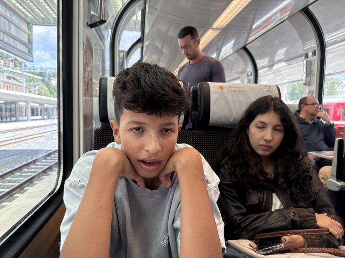 The image depicts the interior of a Bernina Express train carriage, observed while stationary at a railway station. The specific location is the train station in Sankt Moritz, Switzerland, evidenced by the distinctive modern canopy structure of the platforms and the narrow-gauge tracks visible through the left window. In the foreground, a young male, appearing pre-teen or early teen, with dark, curly hair, occupies the central left, looking directly at the camera with his mouth slightly open and his chin resting on his clasped hands. He wears a light gray short-sleeved shirt. To his right, a young female with long, dark, wavy hair is seated, dressed in a dark brown or black leather jacket. Her eyes are partially closed, suggesting rest, and a smartphone with a white case is visible beneath her left hand, which rests on a dark object. Through the window on the left, a railway platform with multiple tracks is visible under a modern white canopy structure. Hills and buildings are present in the background. Within the train carriage, a male with short dark hair and a beard, wearing a dark gray t-shirt, stands in the aisle in the midground, looking downwards. In the background right, an older male with glasses is seated, looking towards the right side of the carriage, with a red train carriage visible outside his window. The train's beige seat headrests display the "Bernina Express" logo, a sun emblem, and the number "2".