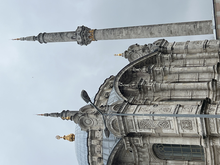 The image displays a detailed view of the upper portions of the Ortaköy Mosque (Büyük Mecidiye Mosque) in the Ortaköy neighborhood of Beşiktaş, Istanbul, Turkey. The mosque's facade is constructed from ornate, light-colored stone, featuring elaborate baroque-style carvings, columns, pilasters, and arched window frames. A segment of the main dome, characterized by its greyish-silver lead covering and topped with a golden finial (crescent and star), is visible on the left. To the right, a single, slender, grey stone minaret rises vertically, culminating in a conical cap and another golden finial. Below the cap, a decorative balcony (şerefe) is visible, adorned with golden accents beneath its railing. Several smaller, decorative spires, each topped with a golden finial, are interspersed across the mosque's roofline and architectural elements. In the foreground, a grey street lamp post with two luminaires is prominently positioned, partially obscuring the mosque's facade. The sky above is uniformly overcast and light grey. A single, small, dark object, consistent with a bird, is faintly visible in the upper right portion of the sky. No individuals or direct interactions are visible.