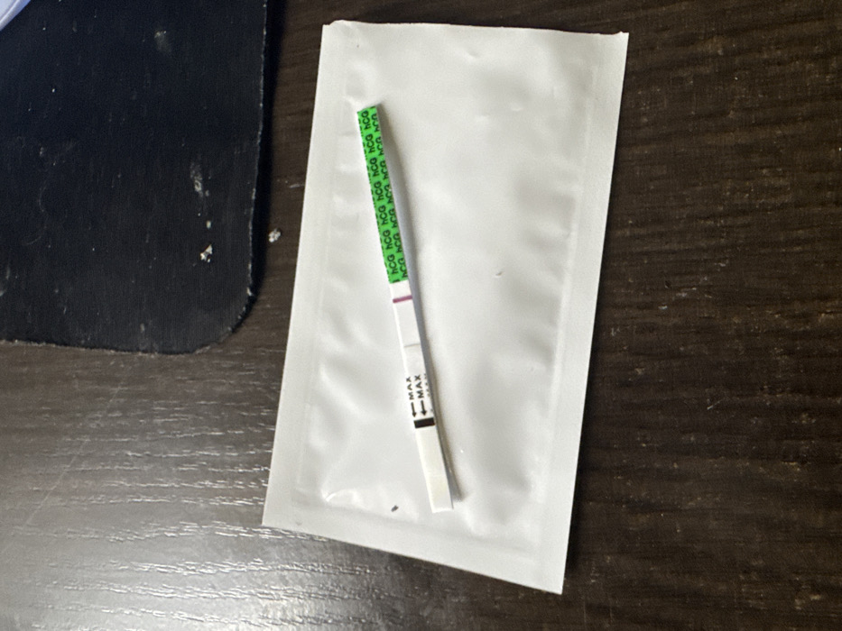 - "A pregnancy test strip sits diagonally on a white, sealed packet against a dark wooden surface" by FM-aV3Hp1, licensed under CC BY 4.0
