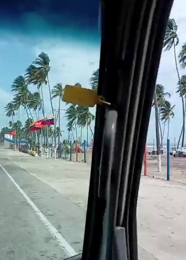 car ride along a coastal road. The road runs parallel to a beach lined with tall palm trees swaying in the wind. Venezuelan flags are posted along the beach. The sky is cloudy. At one point a black car is seen driving in the opposite direction. The video appears to be shot from inside a car or bus, with the windshield and interior of the vehicle visible. The overall impression is of a breezy day at a tropical beach.