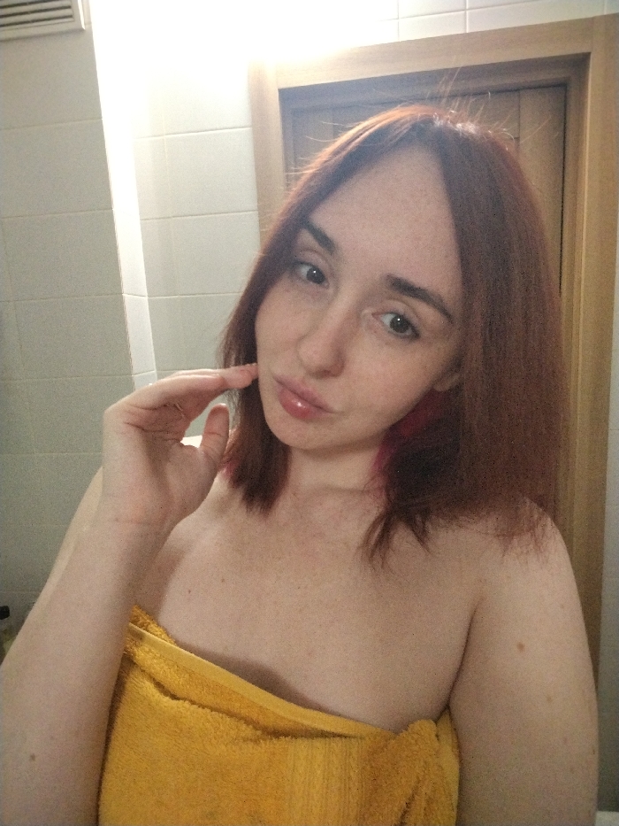 A female individual, with auburn hair and visible freckles on her face and upper body, is depicted taking a selfie