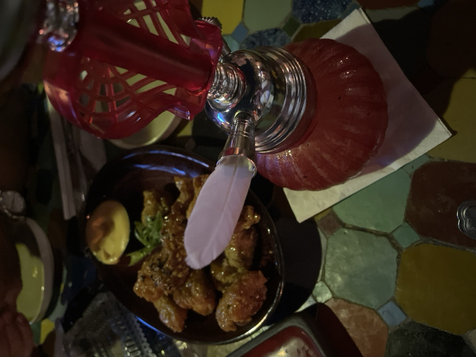 A hookah with a red base and silver stem sits beside a small plate of fried food and a yellow dipping sauce
