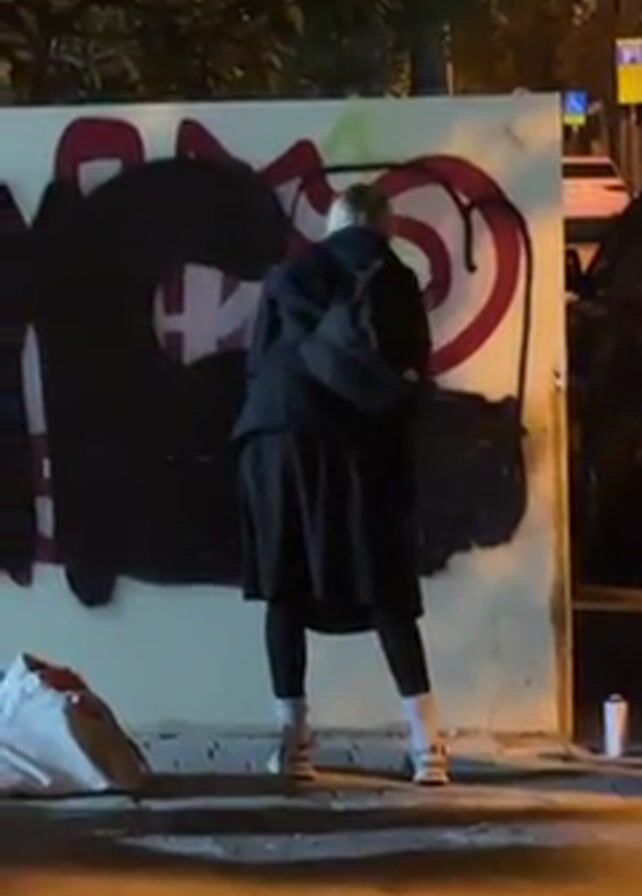 A single individual is seen from the back, spray painting graffiti on a light-colored wall