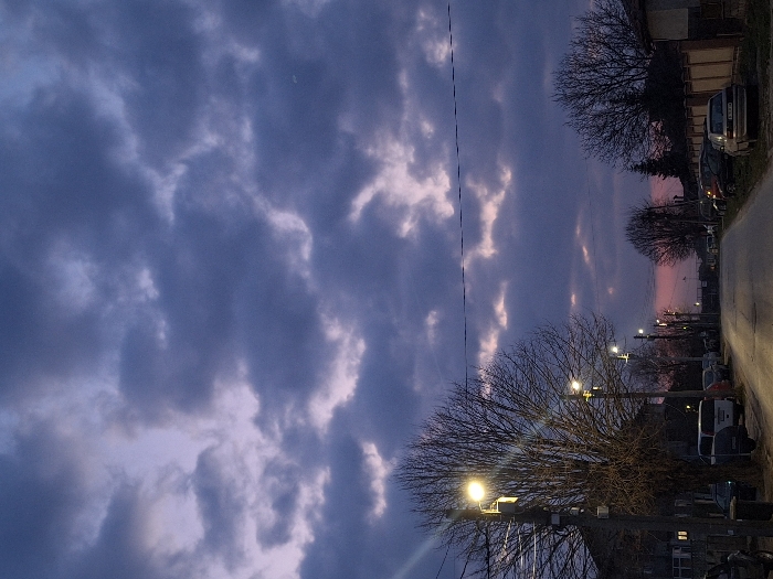 The image depicts a residential street scene in Dolni Chiflik, Bulgaria, at dusk. The sky is largely overcast with dark purple-gray clouds, exhibiting subtle pink and orange hues near the horizon, indicative of a sunset. A paved asphalt road, possibly damp, recedes into the distance, framed by parallel rows of bare deciduous trees and utility poles. Multiple LED streetlights, mounted on these poles, are illuminated, casting bright yellow-white light onto the street and surrounding area, with a prominent lens flare emanating from a streetlight in the foreground on the left. Numerous parked vehicles, including sedans and a white van, line both sides of the road. Partial views of houses and fences are visible behind the trees and parked cars along the street. No individuals are present in the scene.