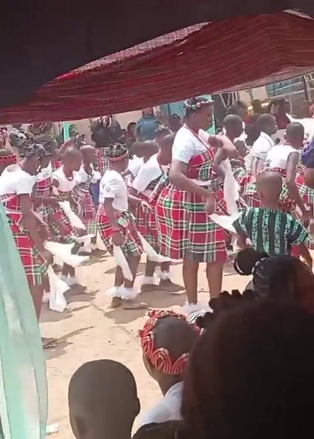 group of children and at least one adult dancing outdoors. They are dressed in matching outfits consisting of white shirts and plaid skirts in shades of red, green, and white. The adult appears to be leading or instructing the dancers. They are performing on a dirt or sand-covered ground, and a simple shelter made of cloth or tarpaulin is overhead, providing shade. People are watching the performance, standing around the dancers. The video appears to be shot from within the audience, with the foreground partially obstructed by a dark object and a light green flag or banner. The overall atmosphere seems celebratory and festive.