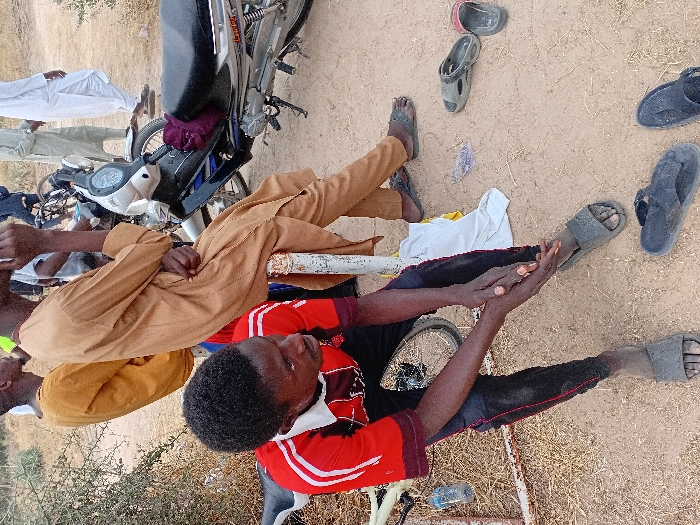 A group relaxes outdoors on a sunny day. Two individuals recline on a white metal structure, one in a red and white shirt with black pants, the other in a tan outfit. A motorcycle sits nearby. Several pairs of sandals are scattered on the ground. Other people are visible in the background. The setting appears to be a rural or sandy area.