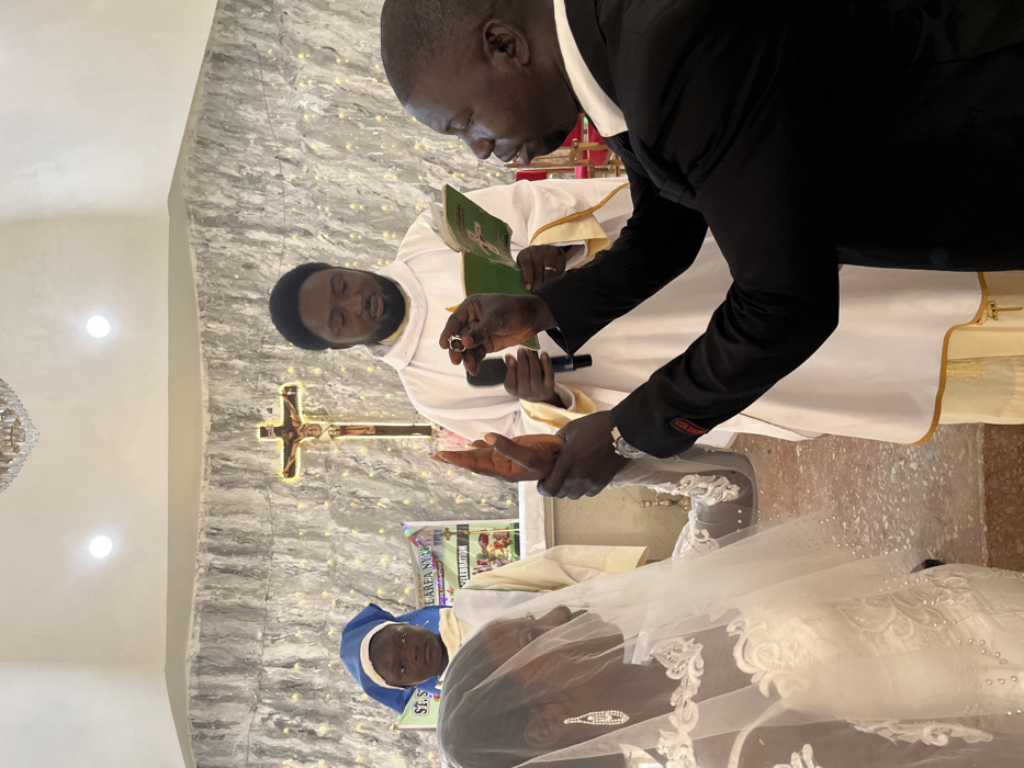 Inside a church in Ajikemai, Nigeria, a wedding ceremony is depicted. A male groom, dressed in a black suit, stands on the right, holding the right hand of the female bride, who is wearing a white wedding gown and veil. The groom holds a wedding ring in his right hand, poised to place it on the bride's finger. A male cleric, wearing a white alb with gold trim, stands between the couple and a large, illuminated crucifix on the back wall. He holds an open green book in his left hand and a microphone in his right, looking down at the book. To the far left, a young female, dressed in a light tunic and blue head covering, observes the scene. The church interior features a textured, light-colored back wall, ceiling lights, and a crystal chandelier. Partially visible banners are present in the left background.