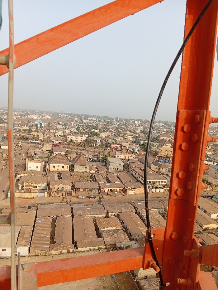 The image depicts an elevated view overlooking Unguwan Sanusi, Nigeria, captured from a large orange metallic lattice structure