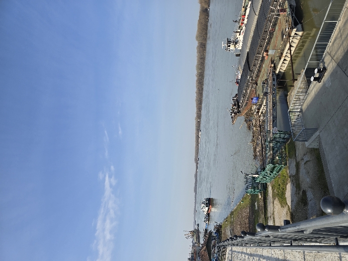 A daytime wide-angle image depicts a scene along the Danube River in Ruse, Bulgaria, viewed from an elevated concrete promenade. The sky is largely clear, exhibiting a pale blue hue with sparse, wispy white cloud formations present in the upper left quadrant. The river, which occupies the central and mid-ground of the image, appears wide, with a grey-green coloration, and its surface shows minimal ripples. The distant riverbank is characterized by a continuous line of deciduous trees, appearing barren of leaves, indicative of a colder season. In the immediate foreground, a grey metal railing with decorative spherical finials runs along the left side of the frame, defining the edge of the elevated concrete promenade or walkway. Below this promenade, a concrete ramp slopes down to a lower-level concrete platform where two black mooring bollards are affixed. This platform connects to a large, multi-sectioned floating dock structure. Moored alongside this floating dock is a long, dark-hulled barge, possibly a cargo vessel, with its deck appearing partially covered. Directly behind it, a white-hulled vessel with a prominent superstructure, consistent with a tugboat, is also docked. Two human figures are faintly visible on the floating dock in the vicinity of the barge; their specific actions cannot be discerned due to distance and resolution. The riverbank between the promenade and the floating dock displays patches of dry, sparse green grass, exposed soil, and a considerable accumulation of natural debris (e.g., branches, logs) mixed with what appears to be man-made refuse at the waterline. Sections of green metal fencing or barriers are erected on this bank, seemingly to contain or define areas near the debris. Further upriver on the left side of the image, additional maritime structures, including a smaller, lighter-colored vessel and industrial port equipment (potentially cranes), are visible near the bank.