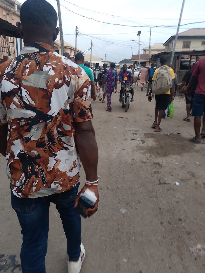 A busy street scene shows a man walking away from the camera. He wears a patterned shirt, jeans, and white shoes. His right hand holds a phone, and he has a bracelet on his wrist. Behind him, people walk, and a motorcyclist rides by. Buildings line the street, and overhead wires crisscross the sky. The ground appears rough and dusty.