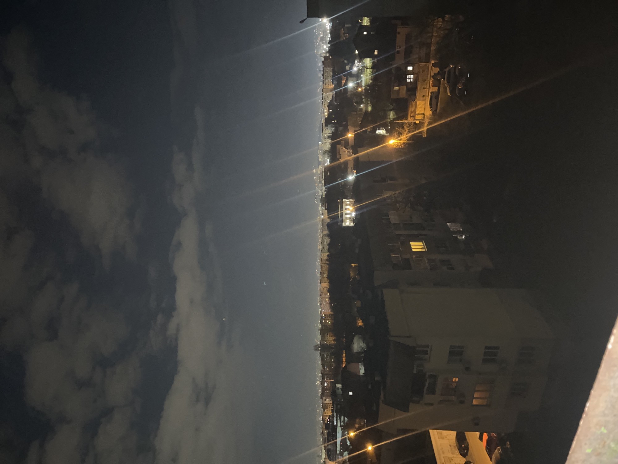 An elevated nighttime panoramic view depicts a densely populated urban area in Sofia, Bulgaria, under an overcast, dark sky. The immediate foreground features a dark, textured concrete railing. Below, several multi-story residential buildings are visible; one prominent, light-colored apartment block to the left displays multiple illuminated windows and balconies, along with visible air conditioning units. Streetlights cast strong orange-yellow illumination, generating multiple diagonal lens flares across the frame. Parked vehicles, including a red car and multiple dark-colored cars, are present on streets or parking areas adjacent to the buildings. Bare trees are interspersed among the structures. The midground and background reveal a vast expanse of city lights stretching towards a hazy horizon, indicative of extensive urban development and significant light pollution. No individuals, explicit actions, or interactions are discernible within the scene.