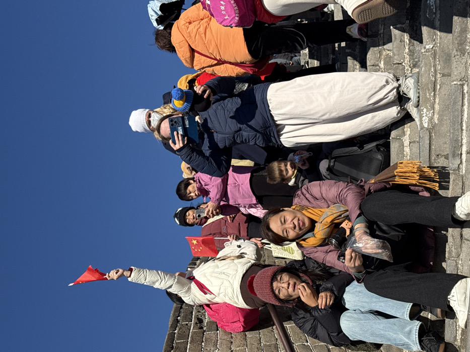 The image depicts approximately fifteen individuals gathered on the stone steps of the Great Wall of China, located in the Yanqing District