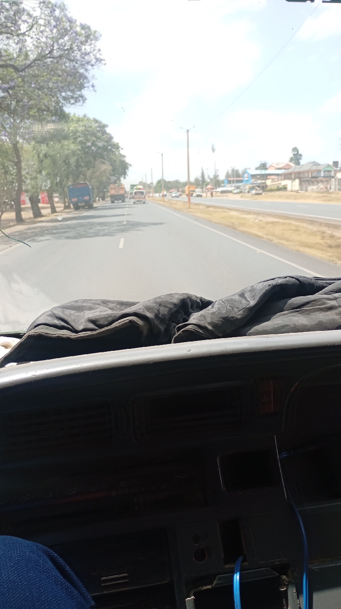 A road stretches ahead, bordered by trees and sparse buildings. Multiple vehicles are in the distance. The viewpoint appears from inside a vehicle, with the dashboard and a dark cloth prominent in the foreground. Blue cables are visible near the bottom right. The scene is captured during daylight hours.