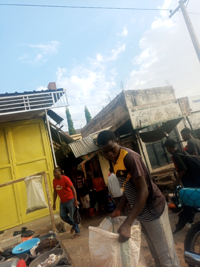 A bustling outdoor market scene under a cloudy sky. People mill about, some examining goods in bowls on the ground. A man in a red shirt walks in the background while another man in a striped shirt and jeans handles a large sack in the foreground. Buildings with signs and corrugated roofs form the backdrop, with a tall electrical pole visible in the corner. A parked motorcycle is on the right.