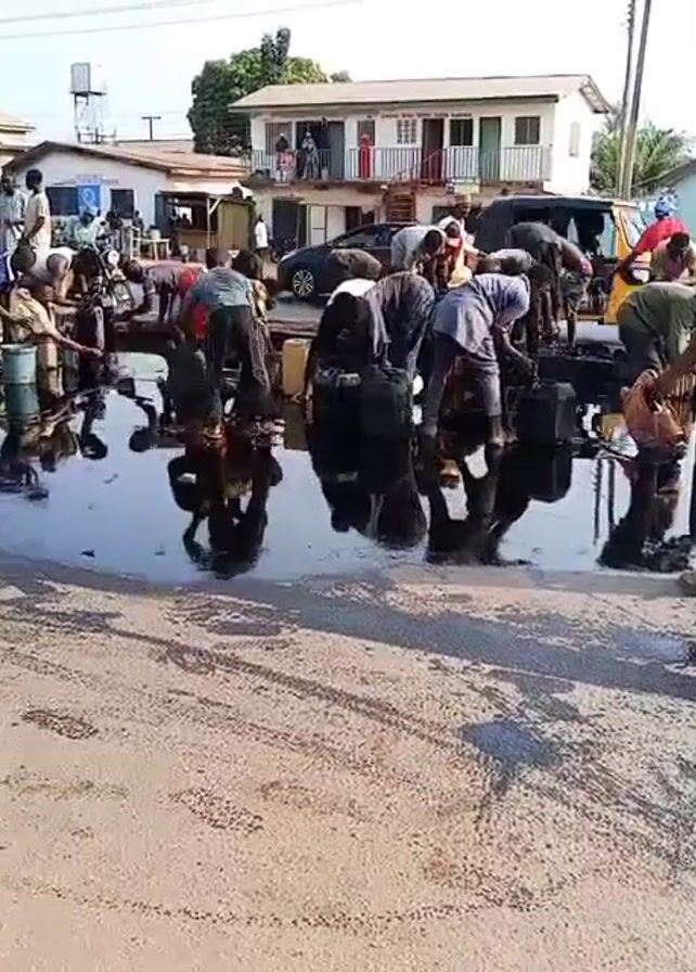 group of people collecting a dark, viscous liquid, possibly oil, from a puddle on a street. They are using buckets and jerry cans to gather the liquid. Several buildings are visible in the background, and there is a crowd of people watching. The video appears to be taken in a residential area, possibly after an accident or spill.