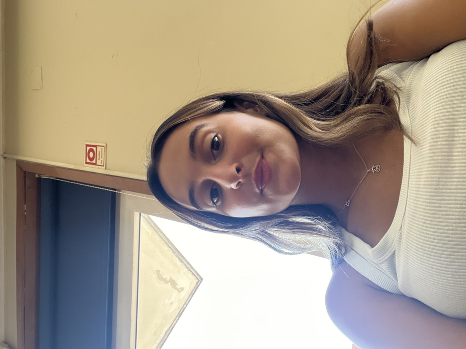 A young woman is depicted in a close-up, upward-angled selfie, positioned indoors in Vila Nova de Gaia, Portugal
