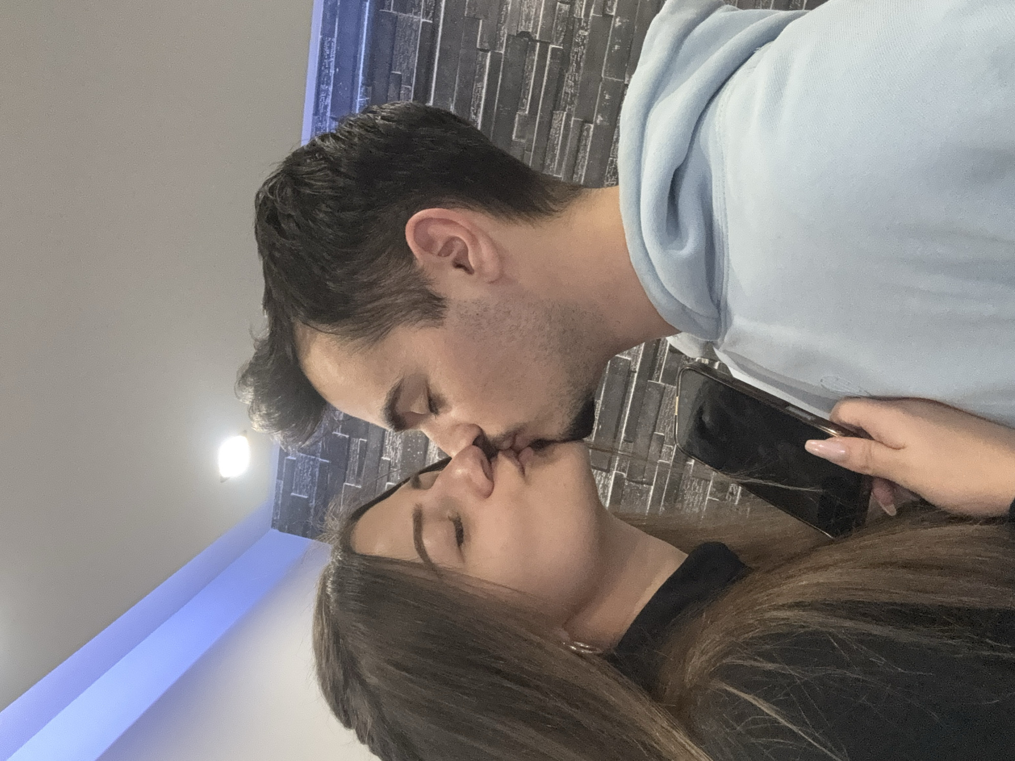 A medium shot depicts a kissing couple. The man, with short dark hair and stubble, wears a light blue hooded sweatshirt. He is leaning downward to kiss the woman, who has long, dark brown hair and is dressed in a black top. Her eyes are closed. The woman is holding a black smartphone in her right hand. The background shows a textured gray brick wall and a white wall with a blue light. The location in Sofia, Bulgaria is not discernible from the visual information.
