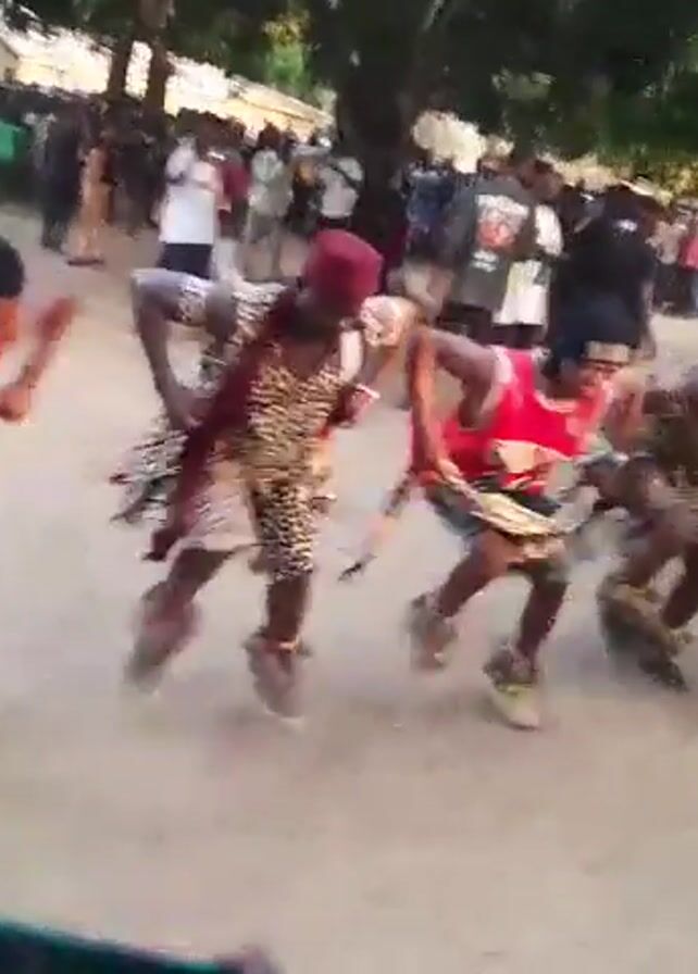 A group of at least six people are seen performing a dance in front of a crowd, on what appears to be a dirt road. The dancers, who wear colorful outfits, are moving in a low, lunging position, with their arms bent and fists clenched. The crowd, composed of many men and some women and children, stands watching, some of them recording with their cell phones. A few trees provide shade to the gathering.