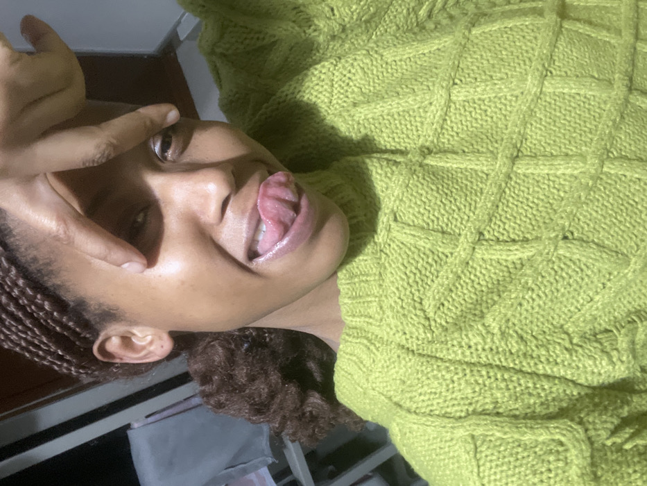 A medium-close-up photograph captures a single individual, appearing to be a young adult with braided hair and a medium-dark skin tone. The person is wearing a prominent lime green, cable-knit sweater with a distinct textured pattern. Their right hand is raised to their face, with fingers partially covering their right eye and forehead. The left eye is open and directed towards the camera, while their mouth is open, extending a visibly textured tongue. The individual displays a discernible smile or grin. The background is largely dark and out of focus, revealing only vague, indistinct shapes of what appear to be furniture or shelving units on the left side, suggesting an indoor environment. There are no identifiable visual markers within the image to confirm the location as Daxing District, China.