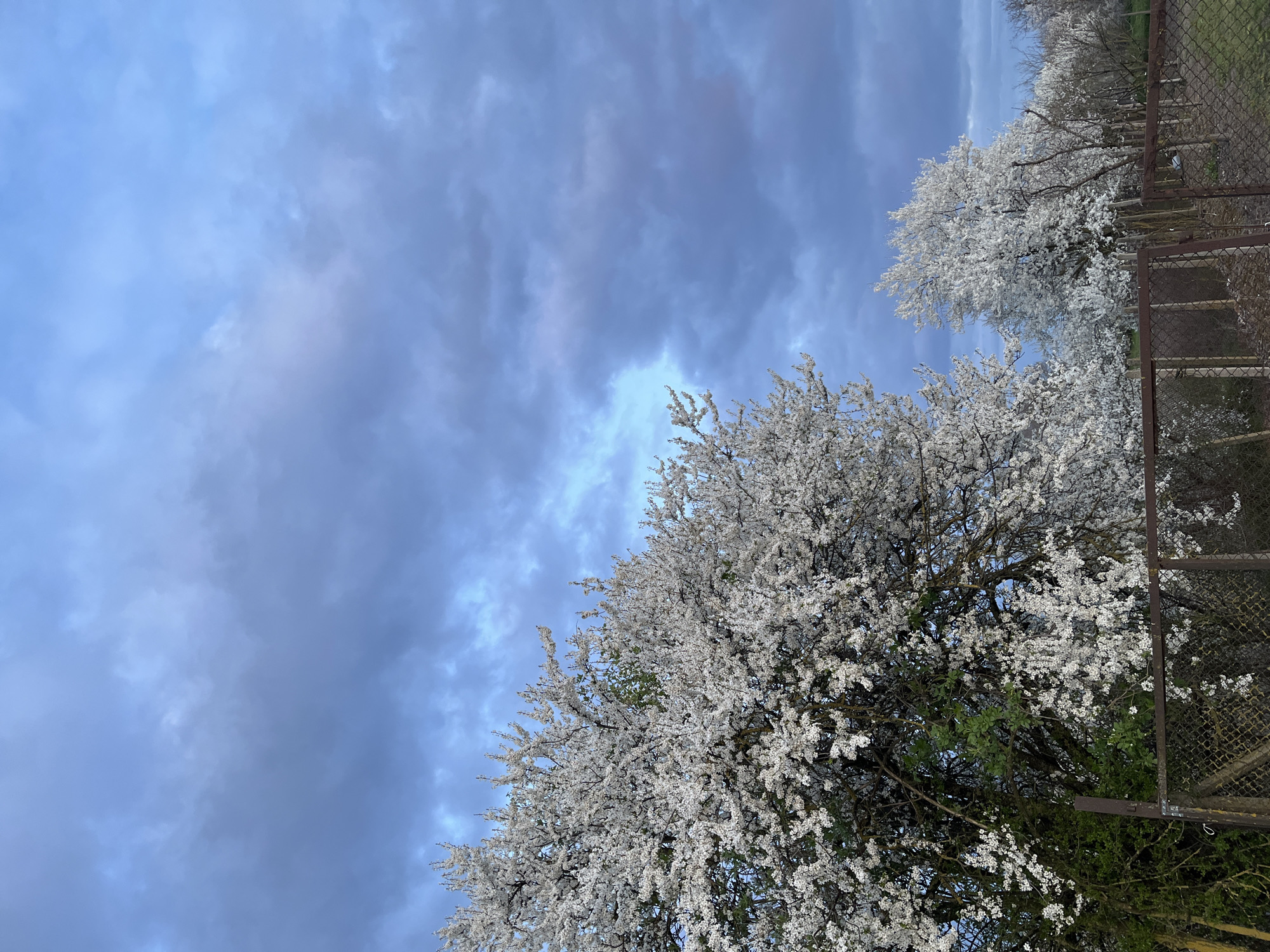 The image presents a view of blooming trees against a cloudy sky in General Toshevo, Bulgaria. The trees are densely covered in white blossoms, possibly fruit trees in spring. A fence made of rusty metal frames the trees. The sky is a mix of blue and grey, with broken cloud cover. The scene is tilted; the horizon and the fence are on an angle.