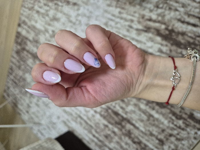 The image displays a close-up, high-angle view of a light-skinned human left hand, fingers slightly splayed, with the palm facing away from the viewer. The nails are manicured, featuring an almond or pointed oval shape with a glossy, light lavender-pink base coat containing fine glitter. Each nail, except for the thumb (which is partially obscured), exhibits a distinct white French tip. The nail on the ring finger also includes a subtle blue and white abstract or floral design situated beneath the white tip. Two bracelets adorn the wrist: a thin red string bracelet with a silver-colored charm depicting two interlocking hearts, positioned above a thicker, silver-colored charm bracelet, likely a snake chain type, which features several attached charms, some appearing spherical or intricately designed. The background consists of a soft, textured surface, identified as a rug or carpet, presenting an abstract pattern in shades of light brown, beige, and possibly grey. A blurred, light-colored vertical element is visible in the upper left background, out of focus. The hand is presented, likely for examination of the manicure and jewelry. Location: Unknown, Unknown.