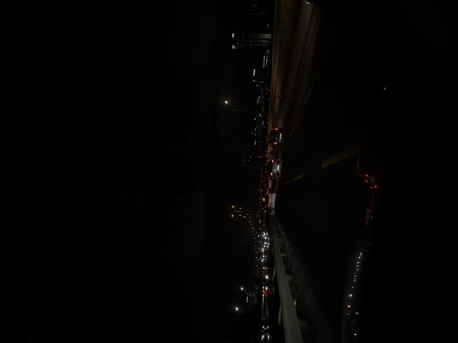A night scene captures a highway with multiple cars driving ahead, illuminated by streetlights. In the distance, city buildings glimmer against the dark sky. The perspective is from inside a car, with hints of the dashboard visible in the foreground. A yellow line marks the road, guiding the flow of traffic. The overall ambiance is dark, with the lights creating a stark contrast.