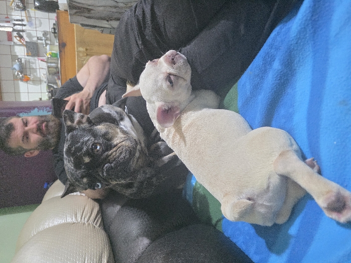 An adult male with a dark beard and short hair is seated on a dark sofa, wearing a black t-shirt and black pants, while engaged with a black smartphone held in both hands. Resting on his lap is a brindle-patterned dog with blue eyes, facing the viewer. A second, light-colored dog is positioned on a blue fleece blanket covering the man's legs and the adjacent sofa surface, appearing to rest with its eyes mostly closed. The background indicates a residential interior in Dupnitsa, Bulgaria, with a partial view of a kitchen area featuring white wall tiles, wooden cabinetry, and hanging utensils visible to the upper right. A light-colored upholstered sofa backrest is present on the left.