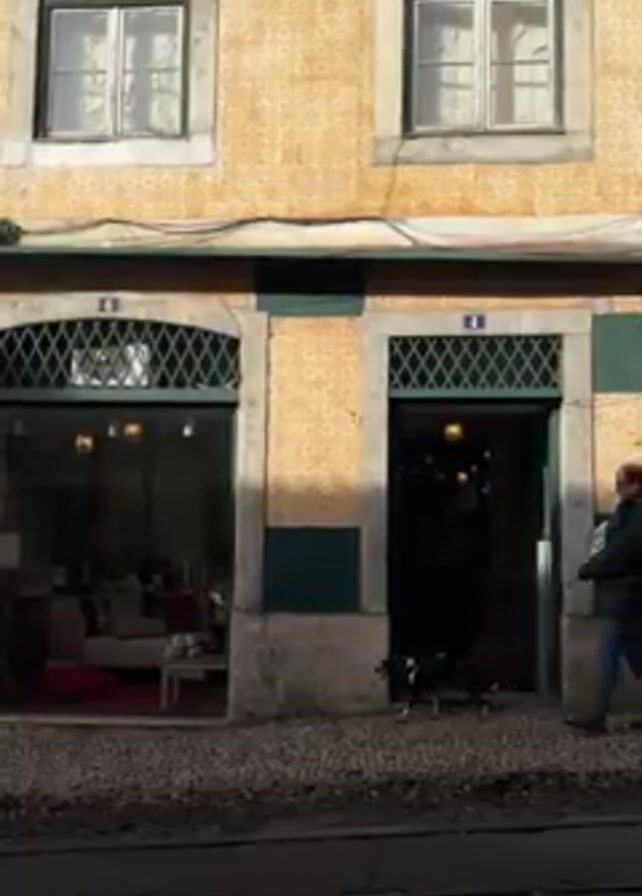A two-story building with yellow tile facade has two doors and two windows on the first floor. A black dog stands near the right door. A man walks out of the door with the dog on a leash. Another person walks by in front of the right door. The street appears to be paved with cobblestones and there is a tram track visible.