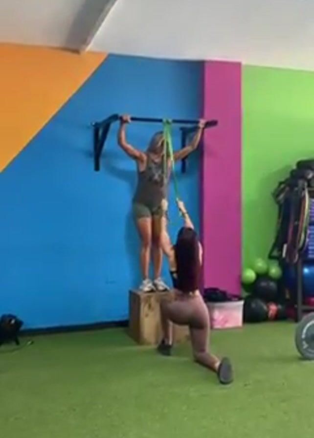two women in a gym. One woman, with blonde hair, stands on a wooden box, holding onto a pull-up bar. A green resistance band is looped around the bar and one of her feet. The second woman, with long, dark hair, is kneeling behind her, holding the resistance band. The gym has a colorful wall with blue, orange, pink, and green sections. There is exercise equipment around the room, including weights, bands, and balls. The floor is green. The camera angle is slightly low, looking up at the women.