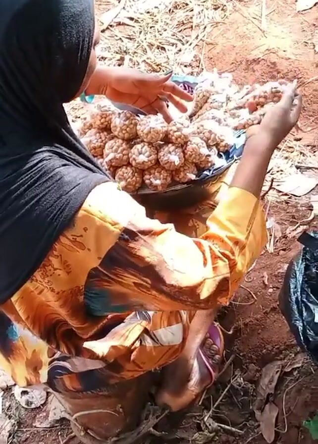 A woman wearing a black hijab and a yellow and brown patterned dress is squatting outdoors. She is arranging small, round packages on a tray. Several green fruits are visible on the ground near her. The ground is mostly bare soil covered with dry leaves and small twigs. There is a black plastic bag beside her.