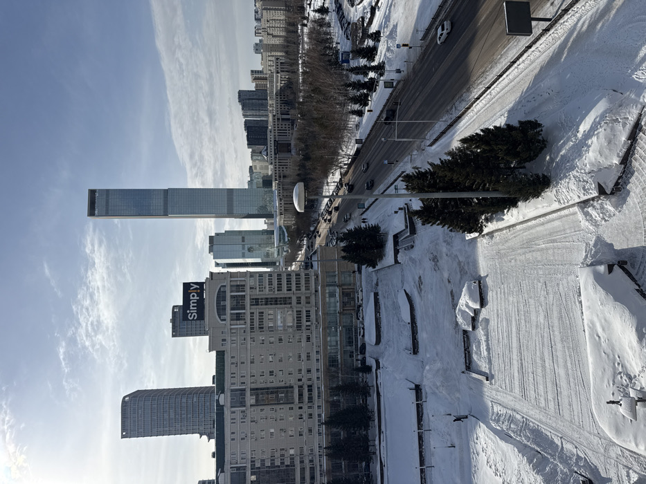 A city scene displays tall buildings against a cloudy sky. A modern skyscraper stands prominently, alongside older structures. A road runs through the city, lined with trees and cars. A significant amount of snow covers the ground and surrounding areas, including sidewalks, benches, and trees. The perspective suggests the photo was taken from an elevated viewpoint, offering a panoramic view of the urban landscape during winter.