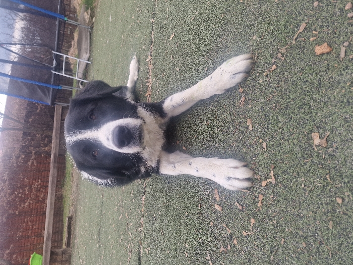 - "A black and white canine, possibly a Border Collie mix, is depicted lying prone on an olive-green artificial turf surface" by FM-386Lh2, licensed under CC BY 4.0