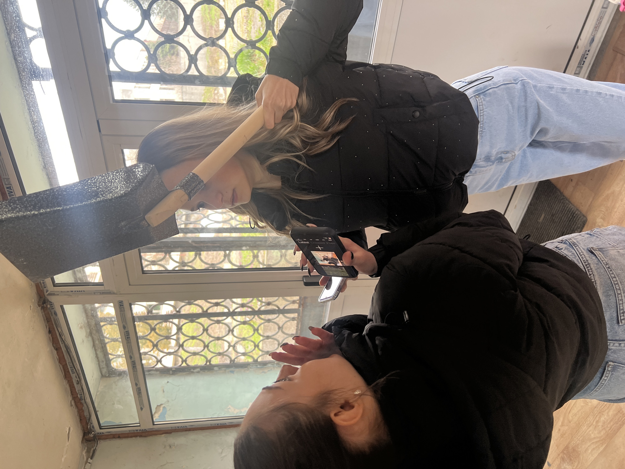 The image depicts an indoor scene in Cherven Bryag, Bulgaria, featuring two young adult females within a room exhibiting signs of wear and exposed building materials. The left female, partially visible, wears a black puffer jacket and light blue denim jeans. Her dark hair is tied back, and her right hand is raised to her face, fingers splayed, with dark nail polish visible. A silver stud earring is present in her visible ear. The right female, standing opposite, has long, wavy light brown hair and wears a black puffer jacket with subtle reflective details and light blue denim jeans. She holds a black metal shovel with a light wooden handle vertically, with the blade positioned above her head. Simultaneously, her right hand operates a black smartphone held horizontally, its screen displaying an active media recording interface. Her gaze is directed towards the left female. The room features light-colored wooden or laminate flooring. The walls are pale, with peeling paint/plaster revealing underlying brickwork or concrete, and exposed electrical wires run along the upper wall near the ceiling. A large multi-pane window or balcony door unit, constructed with white PVC frames displaying "VIVA" branding, dominates the background. This window is fitted with decorative, dark-colored metal security grates. Beyond the grates, an outdoor urban landscape is visible, including patches of green groundcover, bare trees or bushes, and distant buildings under an overcast sky. A dark, textured doormat is partially visible on the floor near the bottom right of the frame.