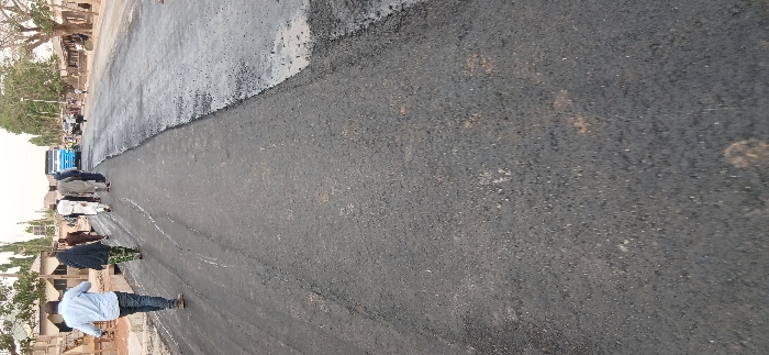 A newly paved asphalt road is seen at an angle. The asphalt on the upper side of the road appears fresher and still wet, while the lower side is dry and already set. Several individuals stand near a truck in the distance, partially obstructing the road. One person is visible in the foreground on the left. Buildings and trees line the sides of the road.
