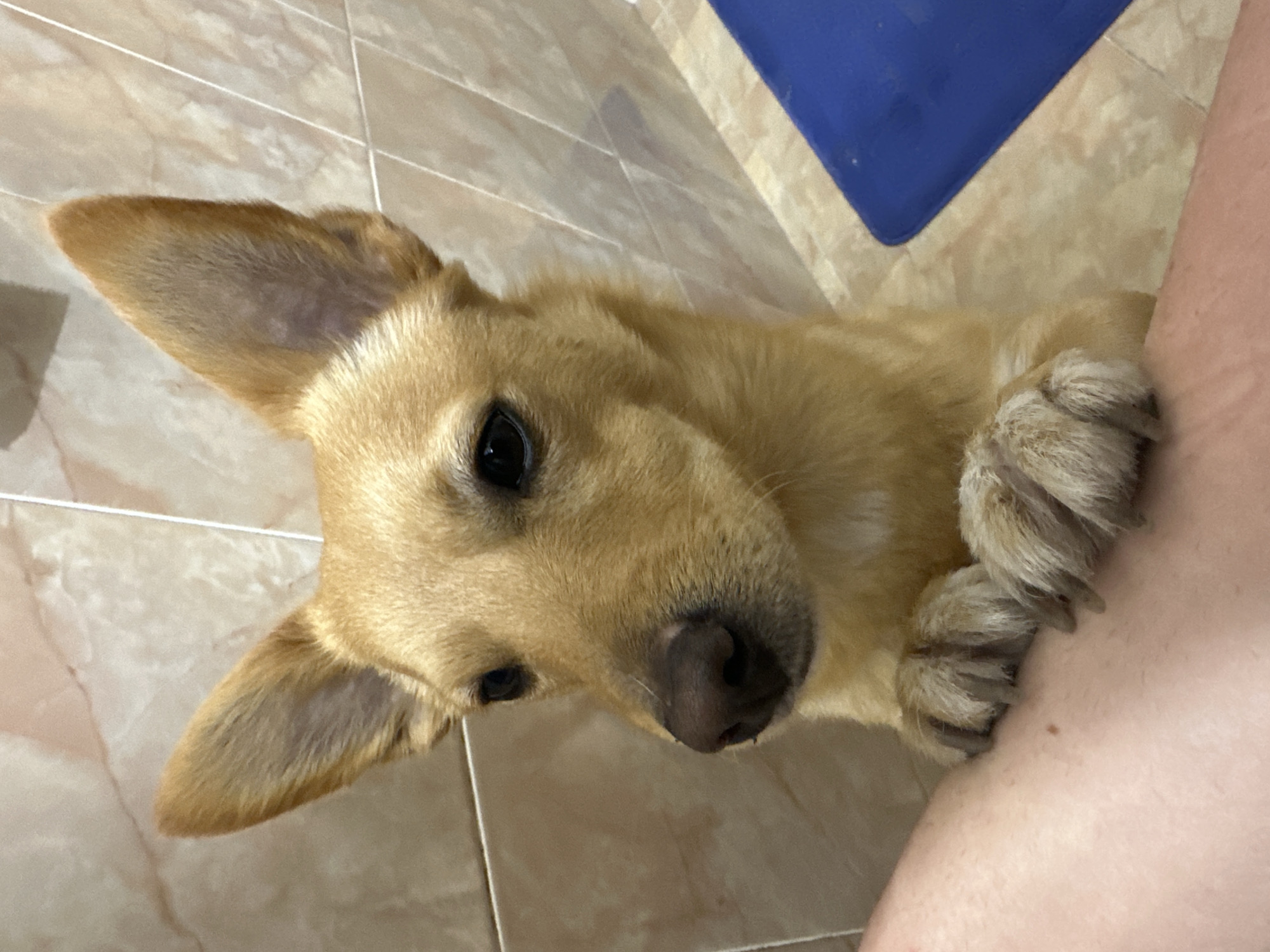A golden-brown dog with large, erect, triangular ears and dark eyes is depicted from the chest up, positioned in an indoor tiled environment in Plovdiv, Bulgaria. Its dark brown nose is prominent, and a single light-colored hair is visible on its muzzle. The dog's two front paws, displaying visible claws and lighter, yellowish-white fur, rest on a light-skinned human leg or thigh, which occupies the lower-left portion of the frame. The dog's gaze is directed forward, towards the viewer. The background consists of light, warm beige-colored ceramic tiles with a subtle marbled pattern and visible grout lines, suggesting a wall and floor junction. A segment of a bright blue rectangular object, possibly a bath mat or container, is visible on the tiled floor in the lower-right corner of the image.