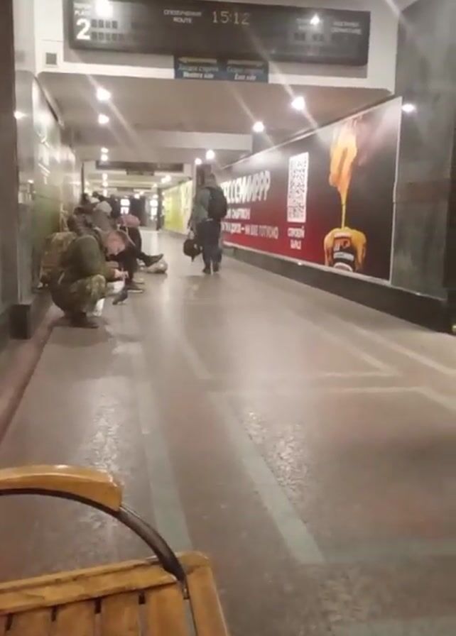 A person is sitting in a wooden chair in a busy waiting area, possibly a train station or transportation hub. Other people are sitting on the floor with backpacks, while others walk past. There are advertisements on the wall, and a digital sign overhead displays information about arrival times or routes. The lighting is bright.