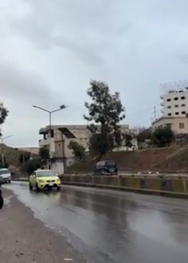 The video depicts a wet, paved road on a cloudy day