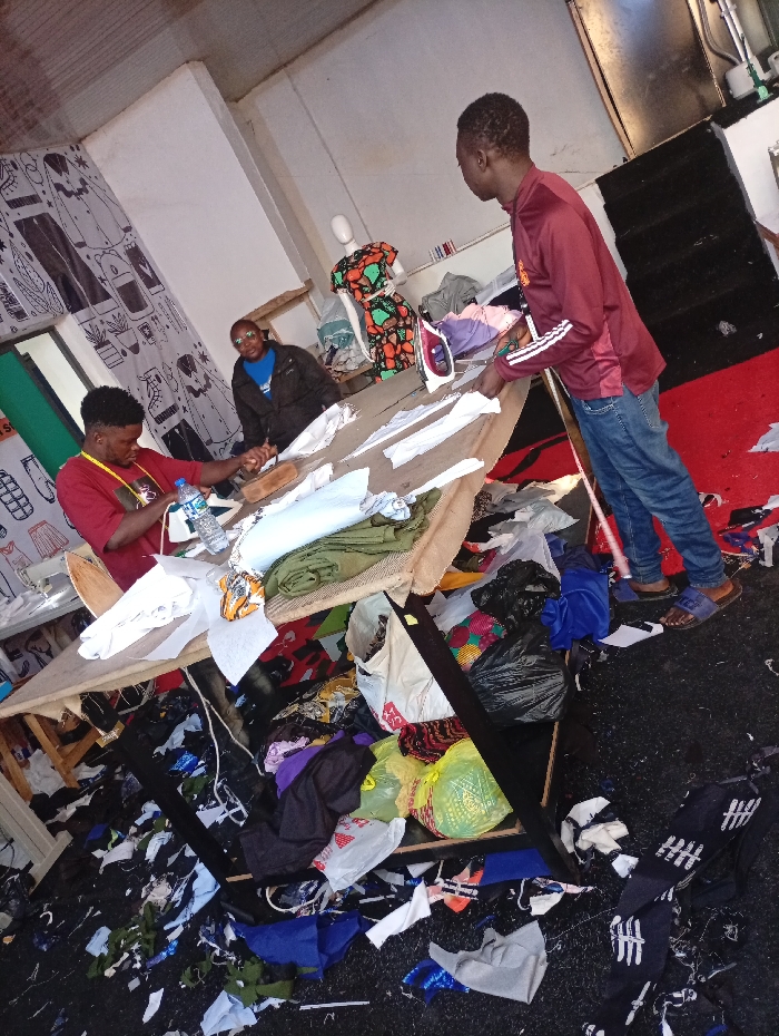 Three individuals are working in a cluttered tailoring space. One person cuts fabric at a table, with a water bottle beside them. Another man is at the table. A third person stands ironing fabric on the table. The floor is covered in fabric scraps and plastic bags. A dress form stands in the background. There is a poster with garment designs on the wall.