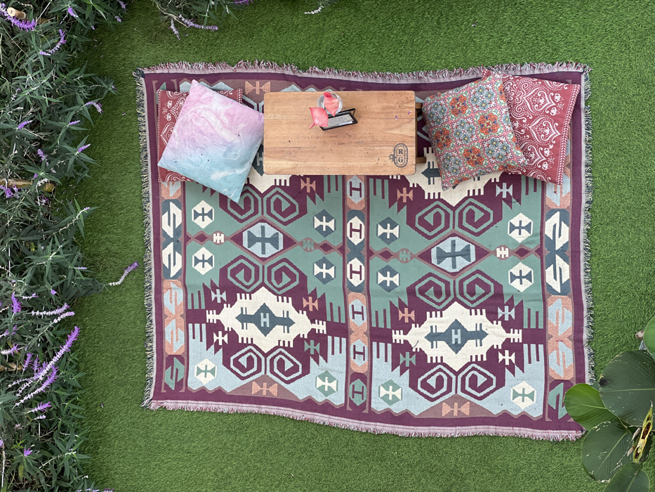 A patterned blanket sits on green grass, holding two pillows, a wooden tray, and a drink. The blanket is geometric, with green, purple, and white designs. The pillows are patterned and colorful. The tray is inscribed with "RG". The grass is surrounded by plants, including lavender. The blanket and pillows invite relaxation.