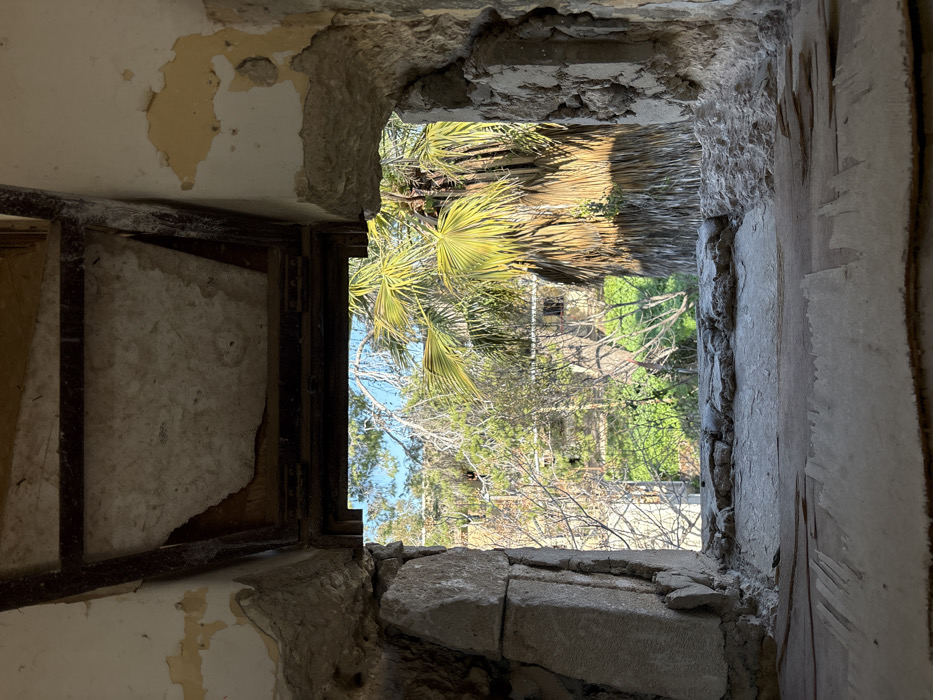 The image depicts an interior view looking outwards through a heavily damaged window opening, located in the Yoav Regional Council, Israel. The foreground is dominated by the severely deteriorated window frame and sill. The frame appears to be constructed of rough concrete or stone, exhibiting significant crumbling, exposed aggregate, and irregular edges. The sill consists of a damaged surface, possibly wood or concrete, with peeling layers and debris. Above the opening, a dark, rectangular structural element, possibly a metal beam, is visible beneath a damaged ceiling with exposed material and flaking plaster. The interior walls immediately surrounding the window show extensive damage, including peeling yellow paint revealing underlying concrete or plaster, and areas where structural elements are exposed. Through the window, an exterior scene is visible under a clear, bright blue sky. A large palm tree with vibrant green fronds occupies the right side of the view, its trunk partially shadowed. Various other trees with mostly bare branches and green foliage are scattered across the mid-ground, suggesting a natural or unkempt landscape. Beyond the vegetation, what appear to be other distant structures or buildings can be discerned, partially obscured by the trees. No individuals are present in the scene. The overall environment suggests an abandoned or severely neglected structure looking out onto a vegetated area under daylight conditions.