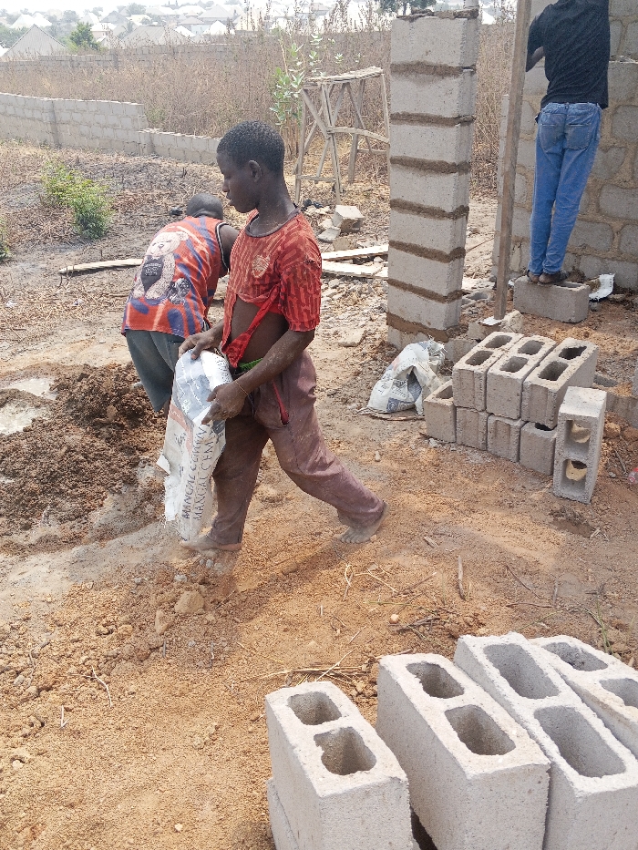 This image captures a construction scene in Zango-ndaji, Nigeria, under bright daylight conditions
